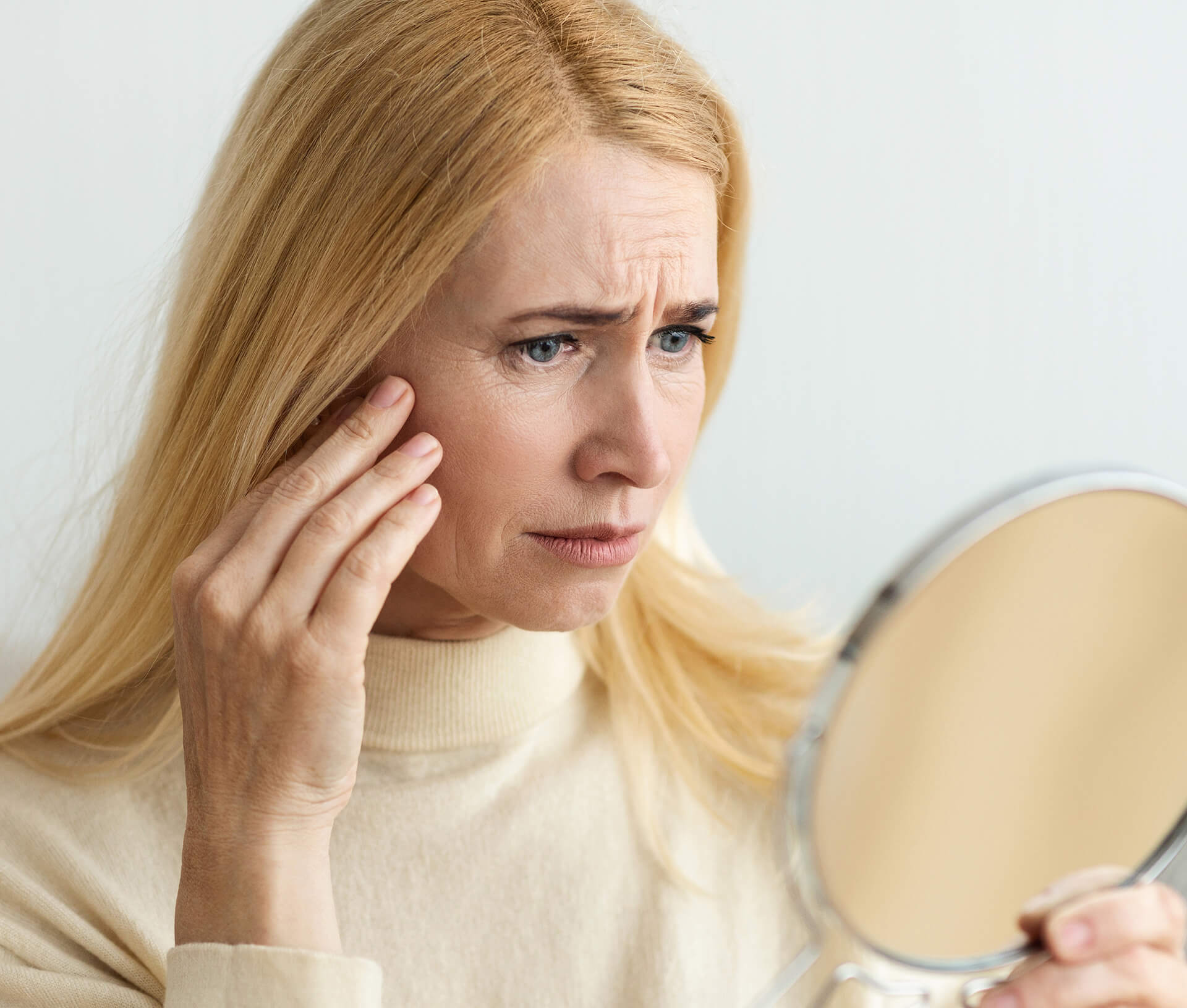 При хроностарении кожи ухудшается ее микроциркуляция: утолщается поверхностный слой, а остальные истончаются. Это замедляет доставку питательных веществ к клеткам и тормозит удаление продуктов их жизнедеятельности. Происходит уменьшение рН, снижается защита от ультрафиолета, а также ослабевает функция эпидермального барьера. Развивается окислительный стресс [3], который замедляет естественную выработку коллагена и гиалуроновой кислоты. Из-за этого ткани лица провисают, черты расплываются, появляются складки и мелкие морщины. Кожа становится неровной и тусклой, на ней может возникать пигментация, купероз и розацеа [4].