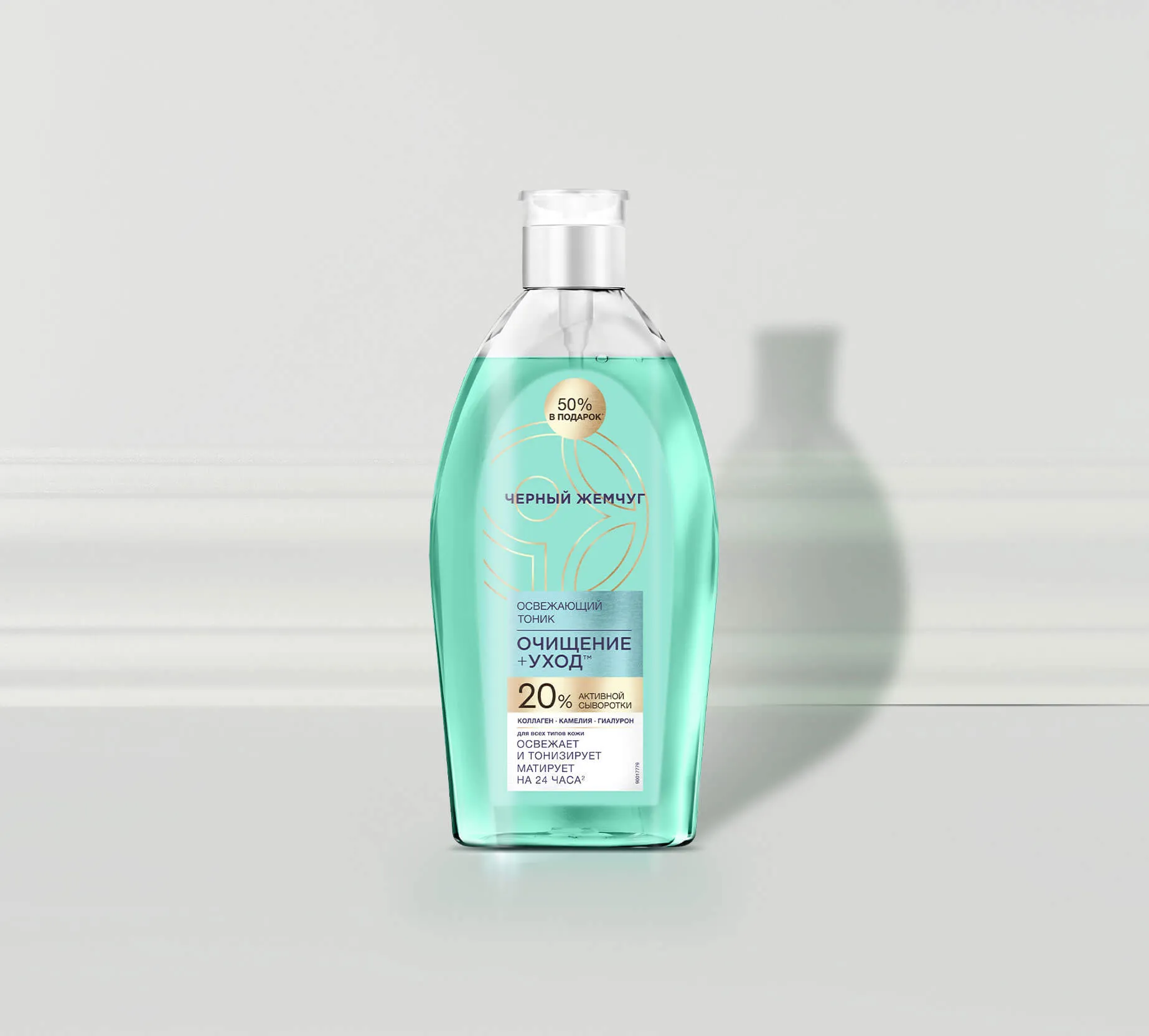 Освежающий тоник Черный Жемчуг – это новый стандарт очищения*. Он дарит ощущение комфорта и свежести, подходит для ежедневного применения. Средство можно использовать для разных типов кожи и возраста.